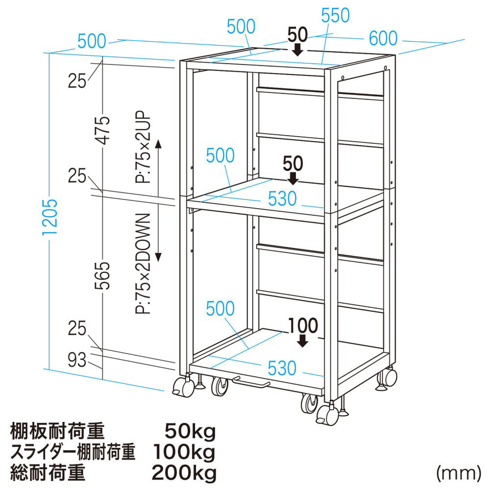 | 仕様1 | [サイズ] W600×D500×H1205mm 天板/W600×D500×t1mm [重量]約25.8kg [出荷形態]ノックダウン組立式(お客様組み立て) [材質]スチール(エポキシ樹脂粉体塗装) [総耐荷重]200kg、各棚/50kg、スライダー棚/100kg [アジャスター]あり [キャスター]あり |