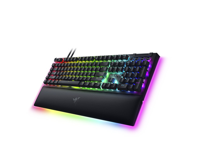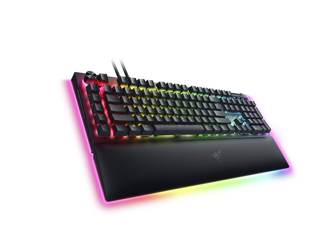 『BlackWidow V4 Pro』はコマンドダイヤル、8 個の専用マクロキー、メディアコントロール、アンダーグロー式ライティング搭載のフルサイズの有線モデルです。
