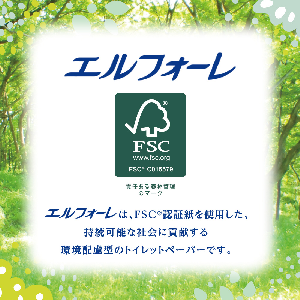 FSC 認証紙を使用した「人にも、森にも、やさしい」トイレットペーパー。ふんわり自然の「やわらかさ」アップ。