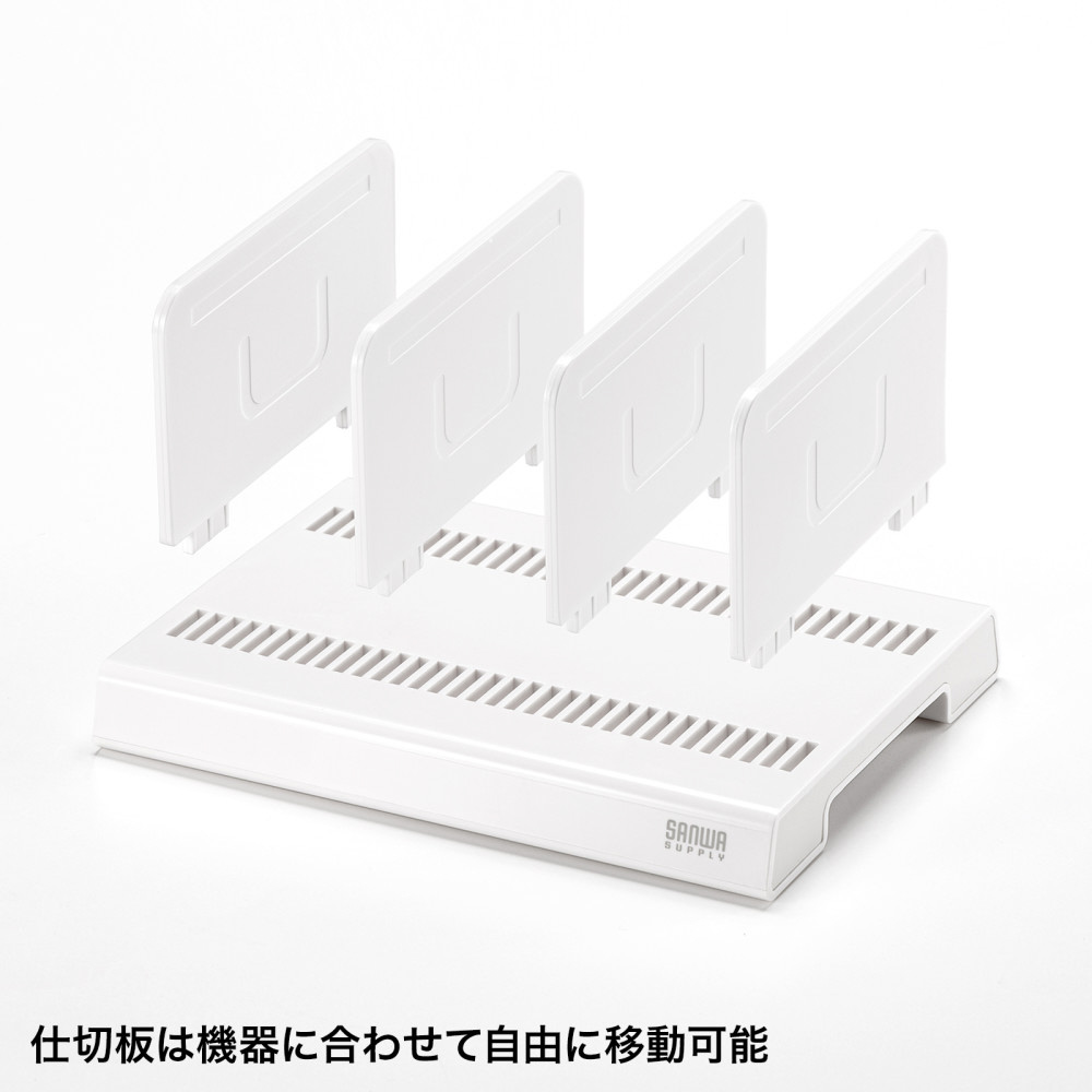 設置機器に合わせて仕切板の取付位置を自由に調整できる、最大10台までの設置に対応したタブレット・スマートフォン用スタンド。