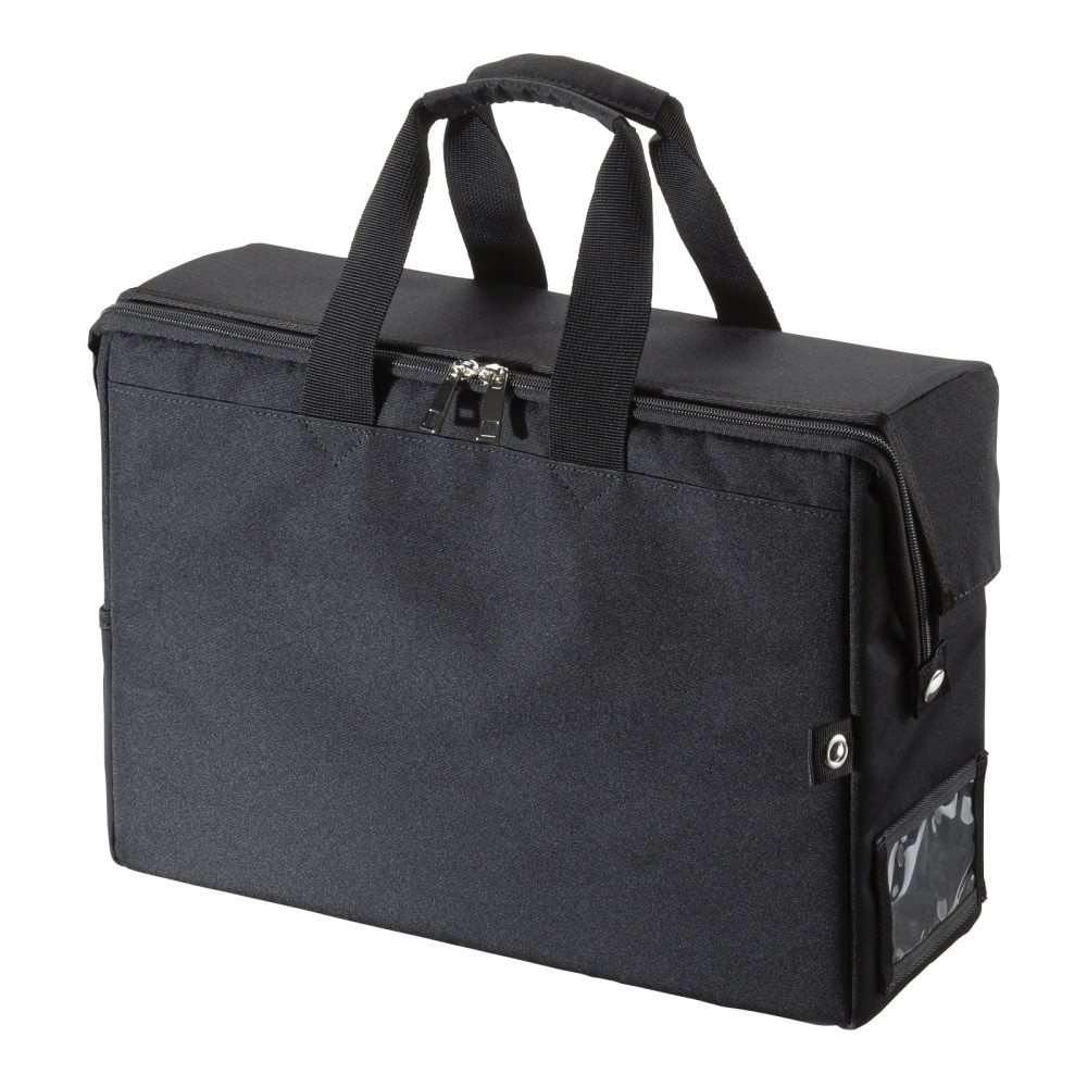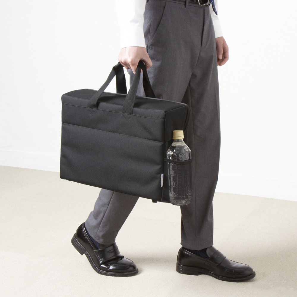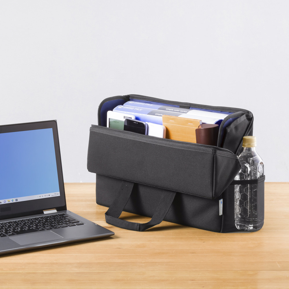 収納物が出し入れしやすいスライドオープンの蓋ふた付きBOX型バッグ。13.3インチワイドまでのノートパソコン対応。