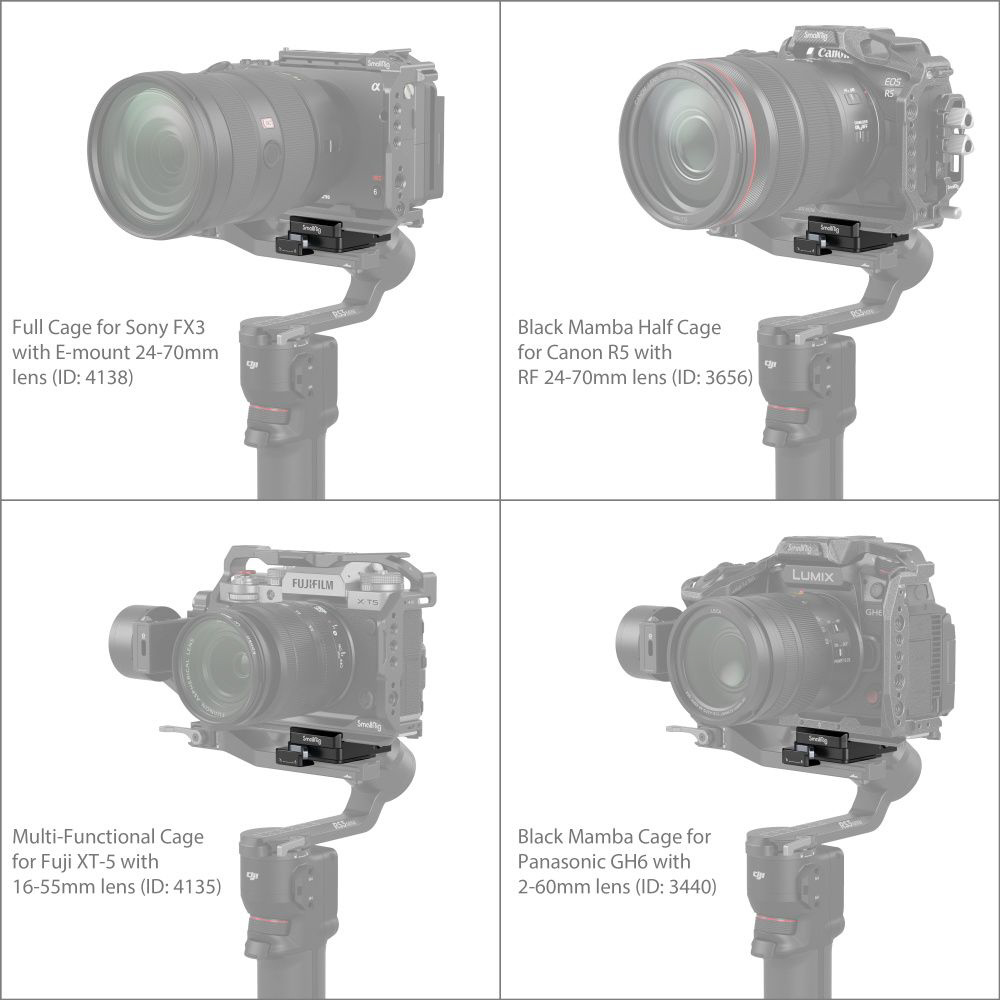24-70mmレンズ付きSony FX3、24-70mmレンズ付きCanon R5、16-55mmレンズ付きFUJIFILM X-T5、12-60mmレンズ付きLUMIX GH6など、その他様々なカメラに対応できるよう設計されています。横や上からスライドさせて装着することも可能です。また、縦位置撮影と横位置撮影を素早く切り替えることができるリグです。