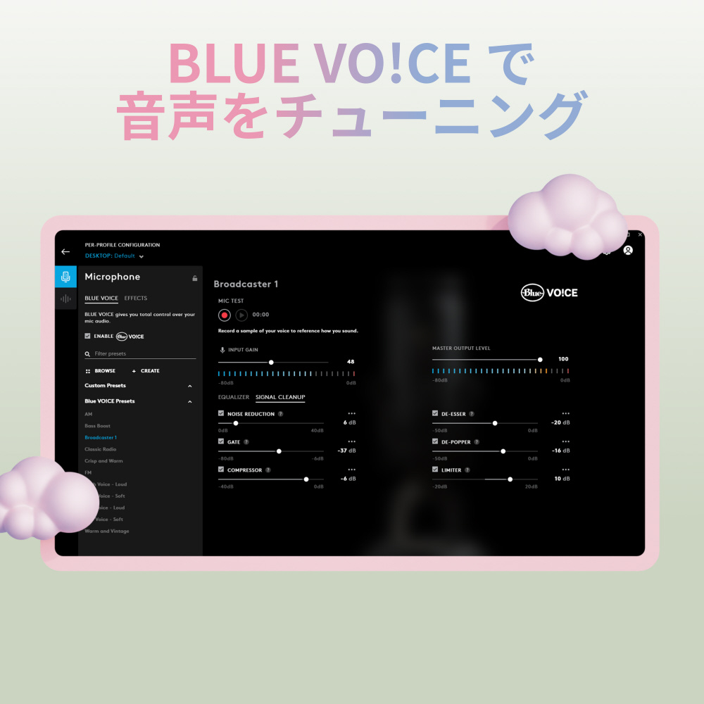 Podcast、YouTube、ゲーム配信、Skype通話、ナレーション、ウェブ会議、オンライン授業等に適した並外れた存在感と繊細さをもつBLUEの伝説的なブロードキャストサウンドクオリティー。