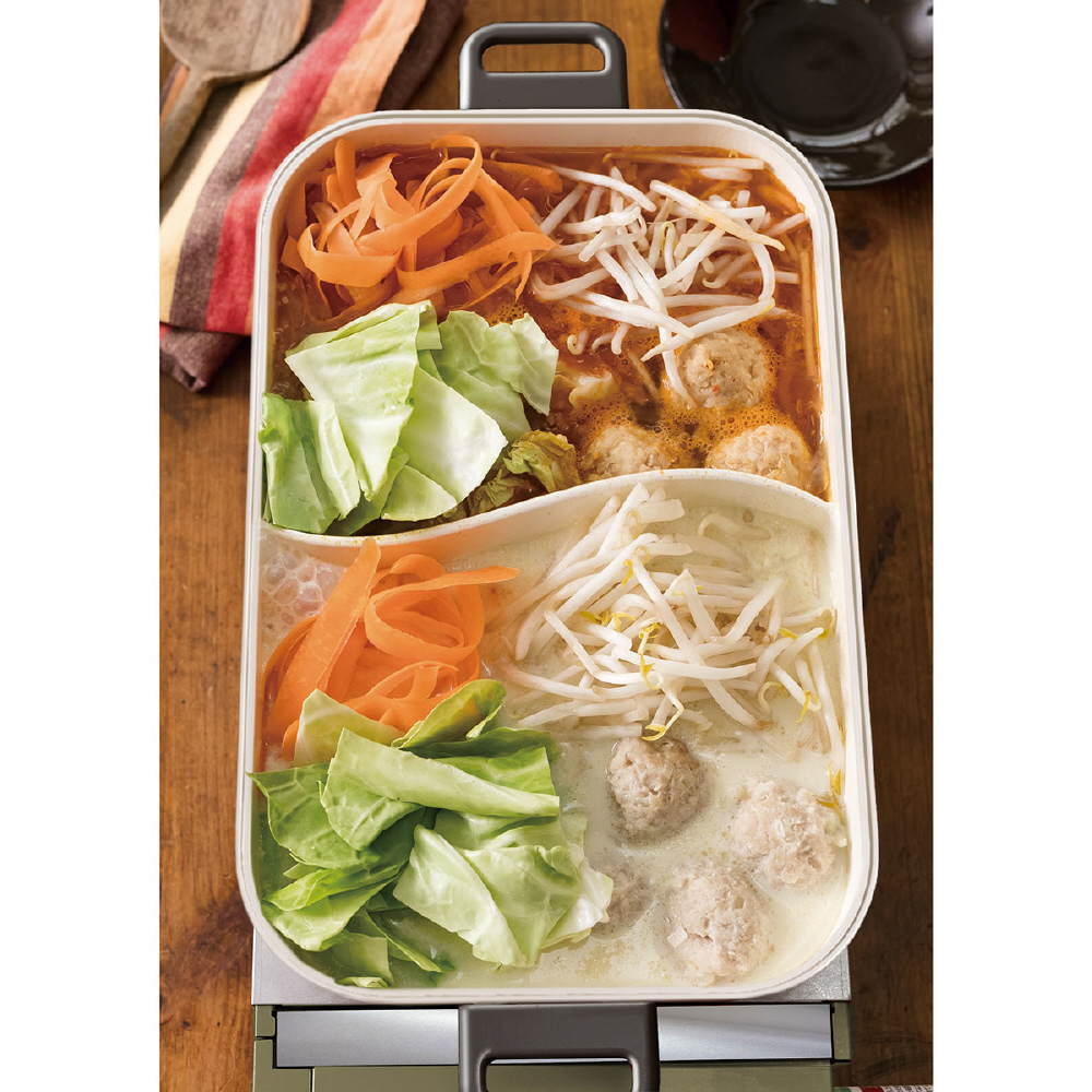 「2色鍋」は、プレートが分かれているので同時に2つの味を楽しめ、効率よく調理ができます。