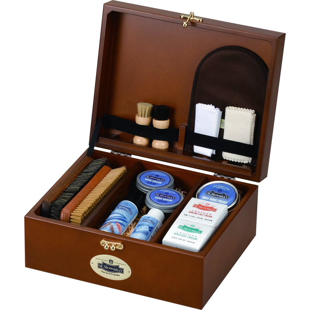 シューケアのセット用にオリジナルに開発されたボックスに靴のお手入れに欠かせないアイテムが組み込まれています。