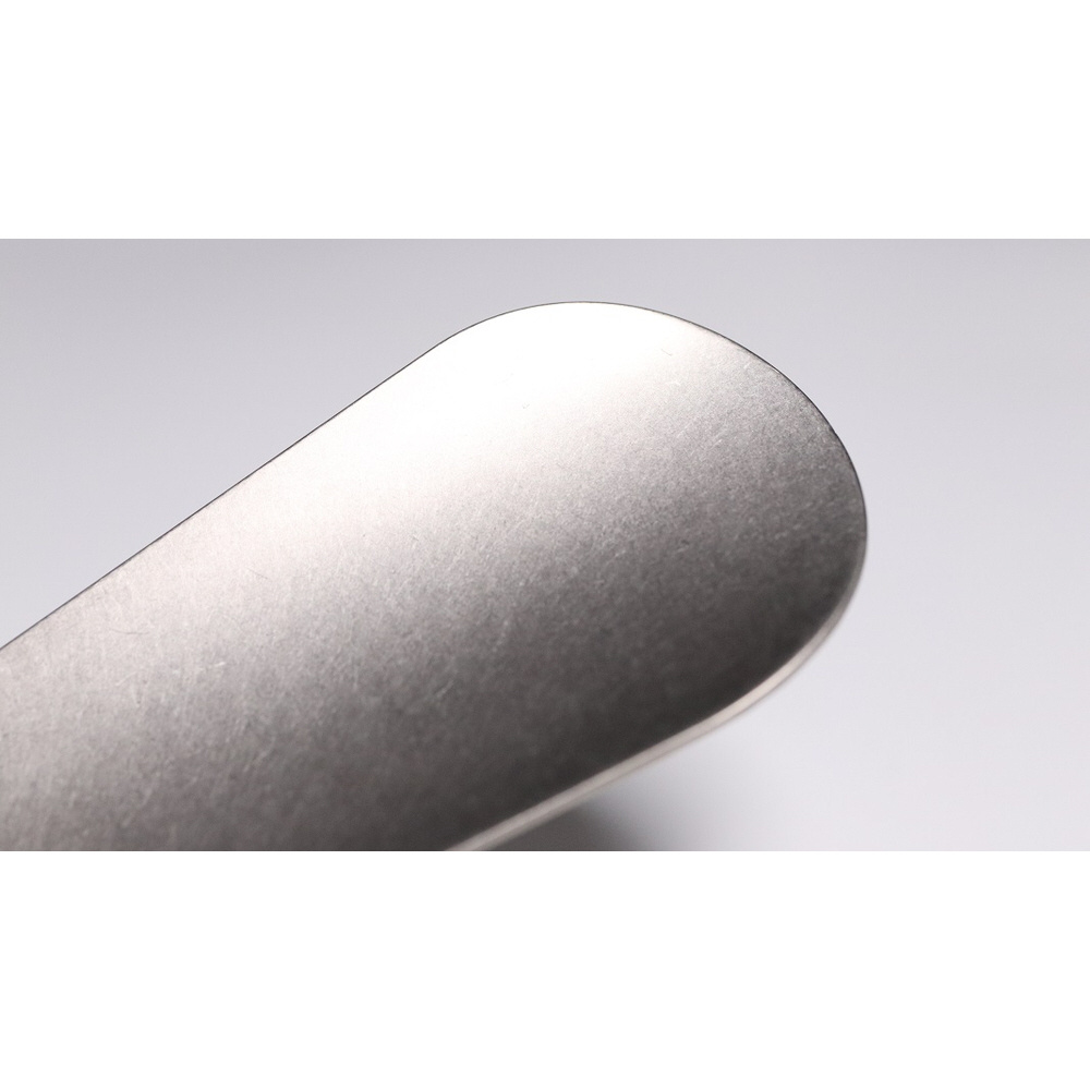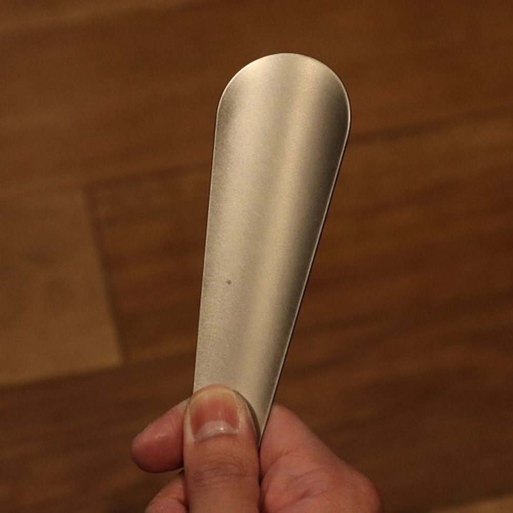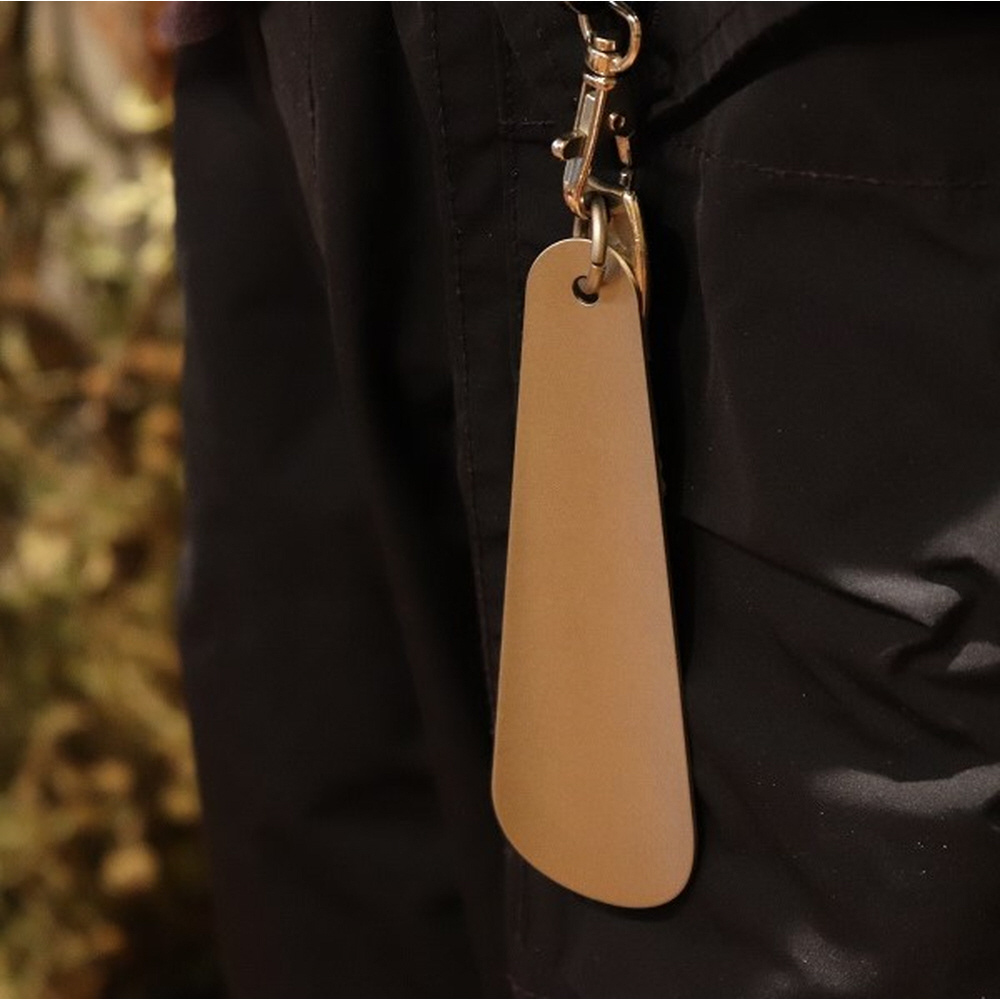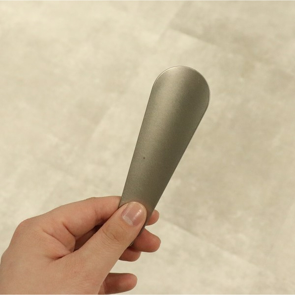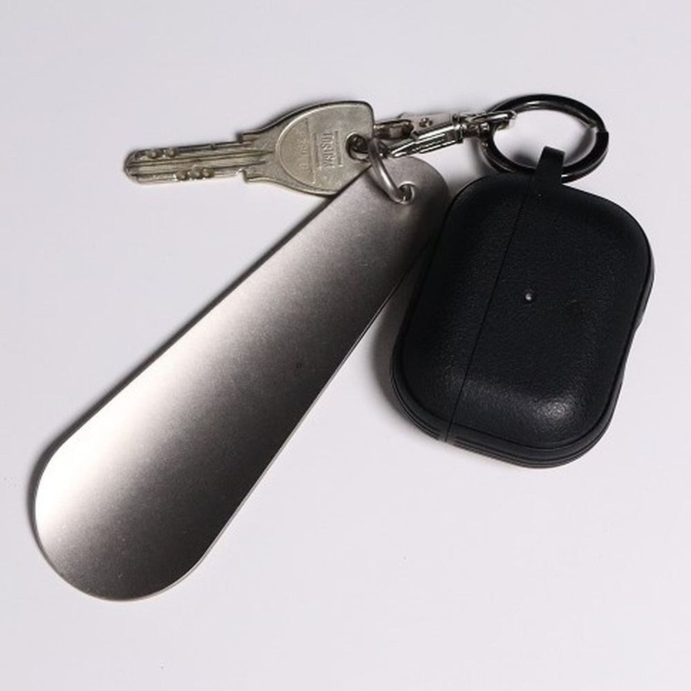 玄関で使用できるサイズでありながらもバッグインして持ち運べるように、ブラスシューホーンからプラス2cmの長さを採用しました。リングがついているので、キーホルダーや鍵などと一緒にアクセサリー感覚で身に付けることもできます。