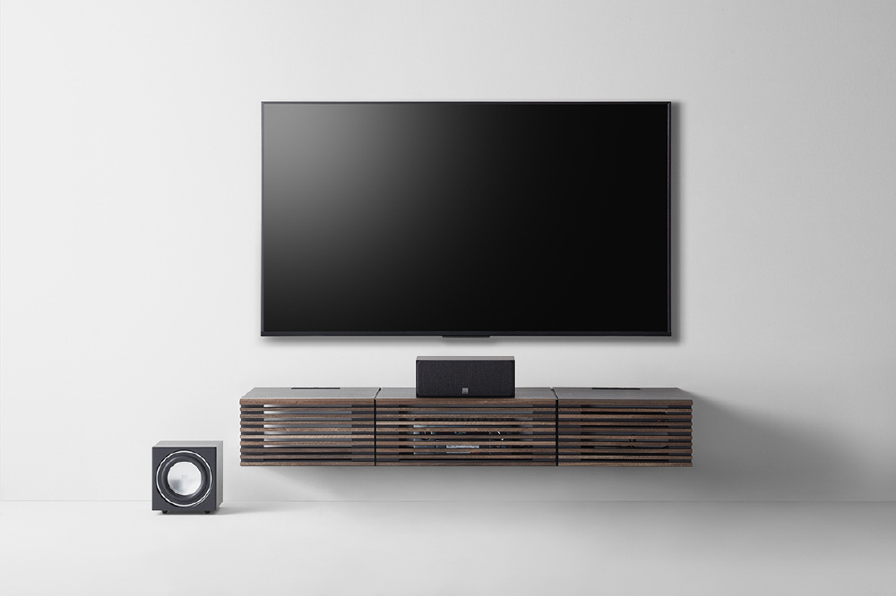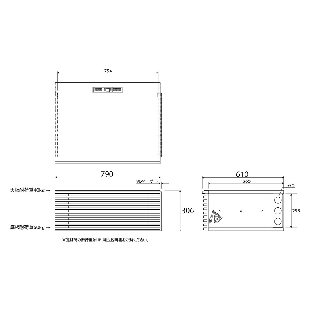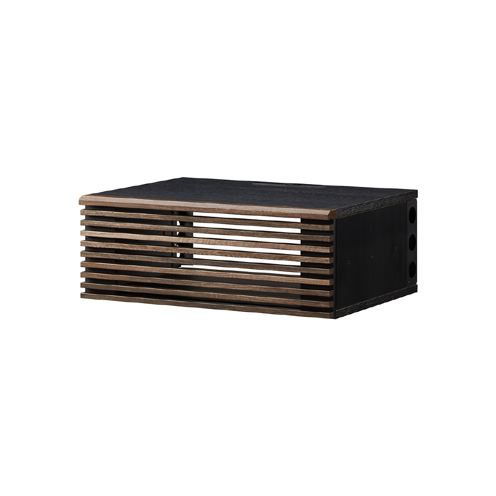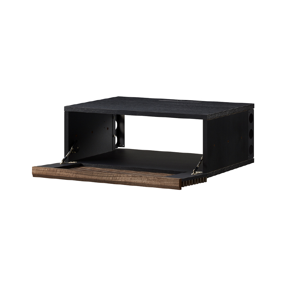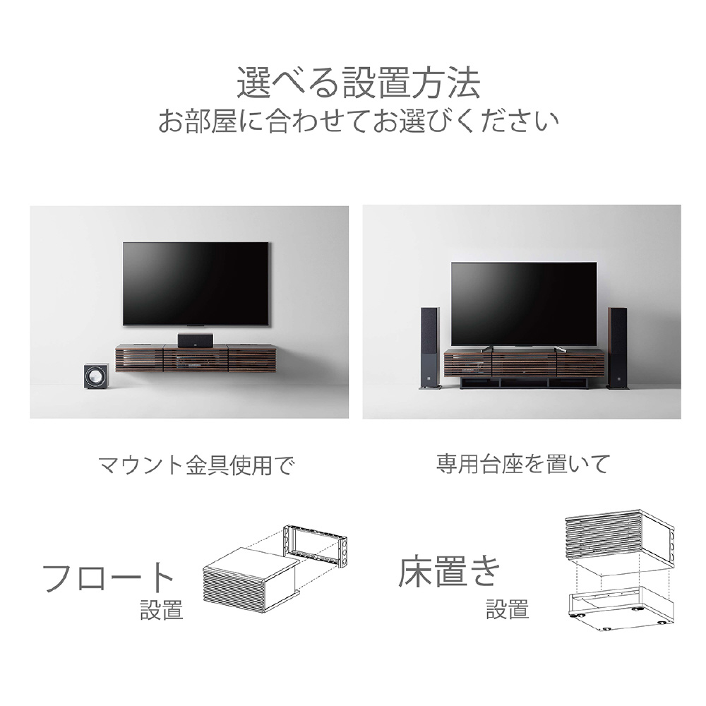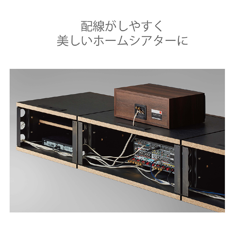スタンダードな置型の他、壁掛け金具を連結させて壁面へのフローティング設置も可能。ラックユニットには、配線孔を設け、配線をスッキリまとめることができる設計です。