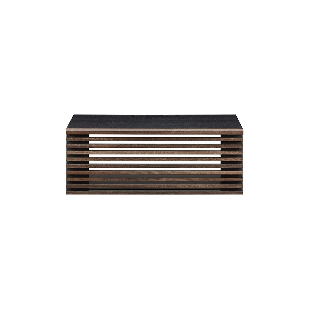 ウォルナット調の格子スタイルが印象的なフラップドアはスタリッシュでどんなインテリアにも調和します。意匠性を求めるだけでなく、収納した機器の放熱対策にも配慮しています。
