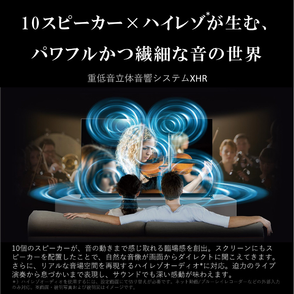 10個のスピーカーが、音の動きまで感じ取れる臨場感を創出。スクリーンにもスピーカーを配置したことで、自然な音像が画面からダイレクトに聞こえてきます。さらに、リアルな音場空間を再現するハイレゾオーディオ*に対応。迫力のライブ演奏から息づかいまで表現し、サウンドでも深い感動が味わえます。