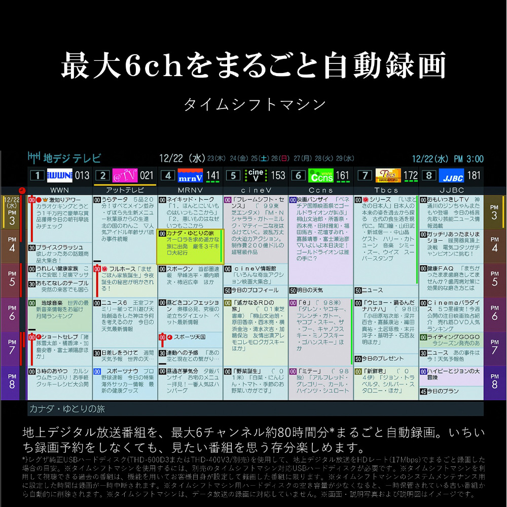 | 出力端子 | 光デジタル音声出力×1 / LAN×1 / USB×4(タイムシフトマシン専用×2 / 通常録画専用×1 / 汎用×1)/ ヘッドホン×1 |