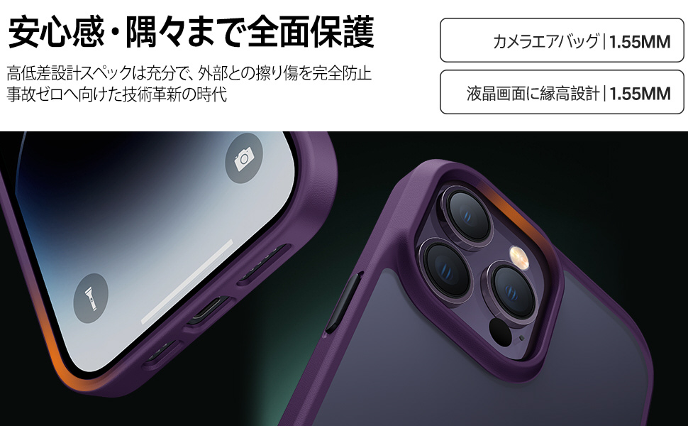 〇ケースの縁が端末のディスプレイやカメラレンズより1.55mm高く、机などの平面に置いても傷付かない設計