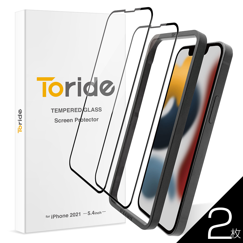 Toride ホコリが入らない iPhone13 mini用 ガラスフィルム 2枚入り 全面保護 角割れしない ソフトフレーム クリア DUSTLESS加工 10H 0.25mm 貼付けガイド トリデ 【852】