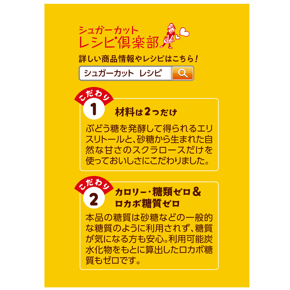ぶどう糖を発酵して得られる「エリスリトール」と、砂糖から生まれた自然な甘さの「スクラロース」をバランスよく配合した、砂糖に近いおいしい甘さの甘味料です。
