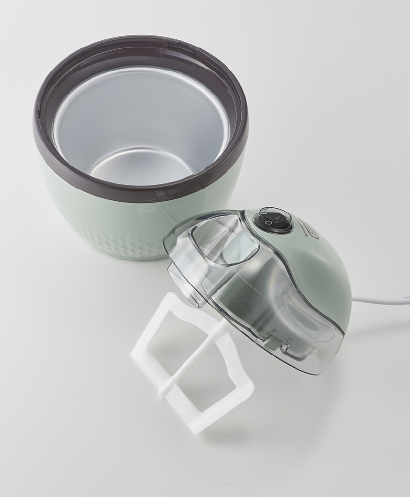 保冷ポットを冷凍庫で冷やしたあとは、材料を入れてスイッチを入れるだけで簡単にアイスができる!