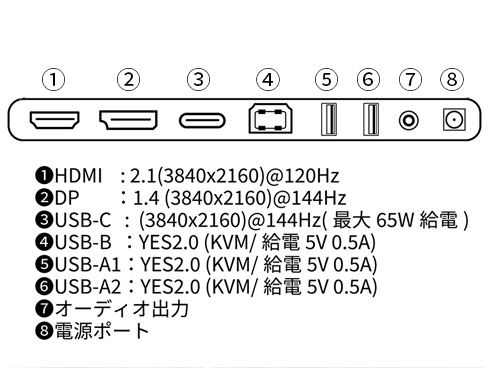 ■入力端子としてHDMI 2.1(120Hz)とDisplayPort 1.4(144Hz)、さらに65W給電が可能なUSB Type-C(144Hz)を搭載、対応のPCであれば液晶モニター側からノートPCへ給電が可能です。