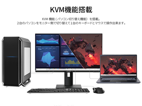 ■さらにKVM機能に対応、モニターに接続したキーボード、マウスをデスクトップPCやUSB Type-C接続のノートPCで入力を切り替えた際にもそのまま使用可能です。