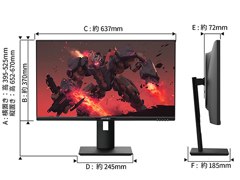 | 本体サイズ | 横置き:高395〜525x幅637x奥行185mm 縦置き:高652〜670x幅370x奥行185mm スタンド前面幅:245mm 高370x幅637x奥行72mm(スタンド無し) |