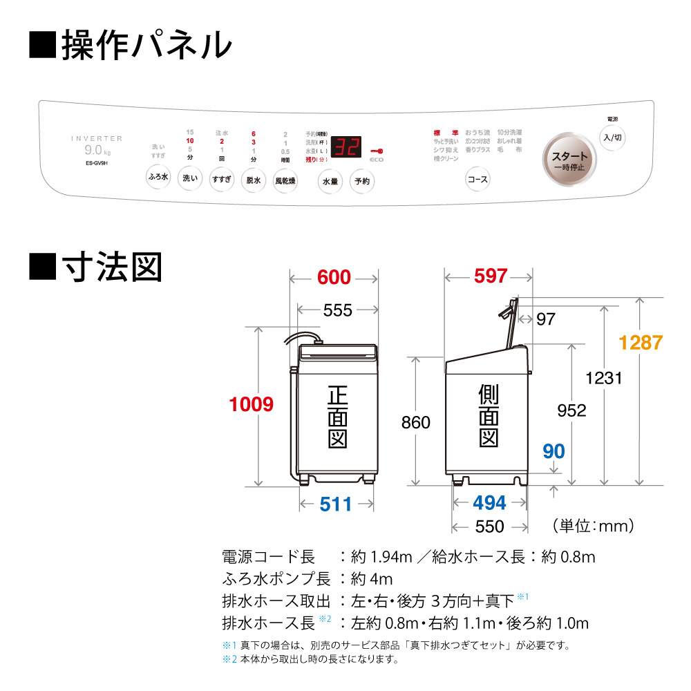 | コース | 標準(9kg)、おうち流(9kg)、サッと予洗い(0.5kg)、ガンコつけおき(4.5kg)、ペット用衣類 洗い対応(1kg)、おしゃれ着(2kg)、シワ抑え(1kg)、10分洗濯(1.5kg)、香りプラス(2kg)、毛布(4.2kg)、風乾燥[化繊](4kg[3kg]) |