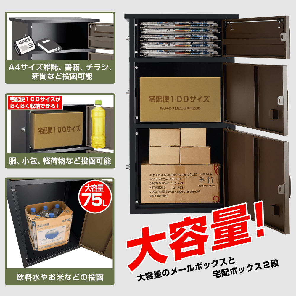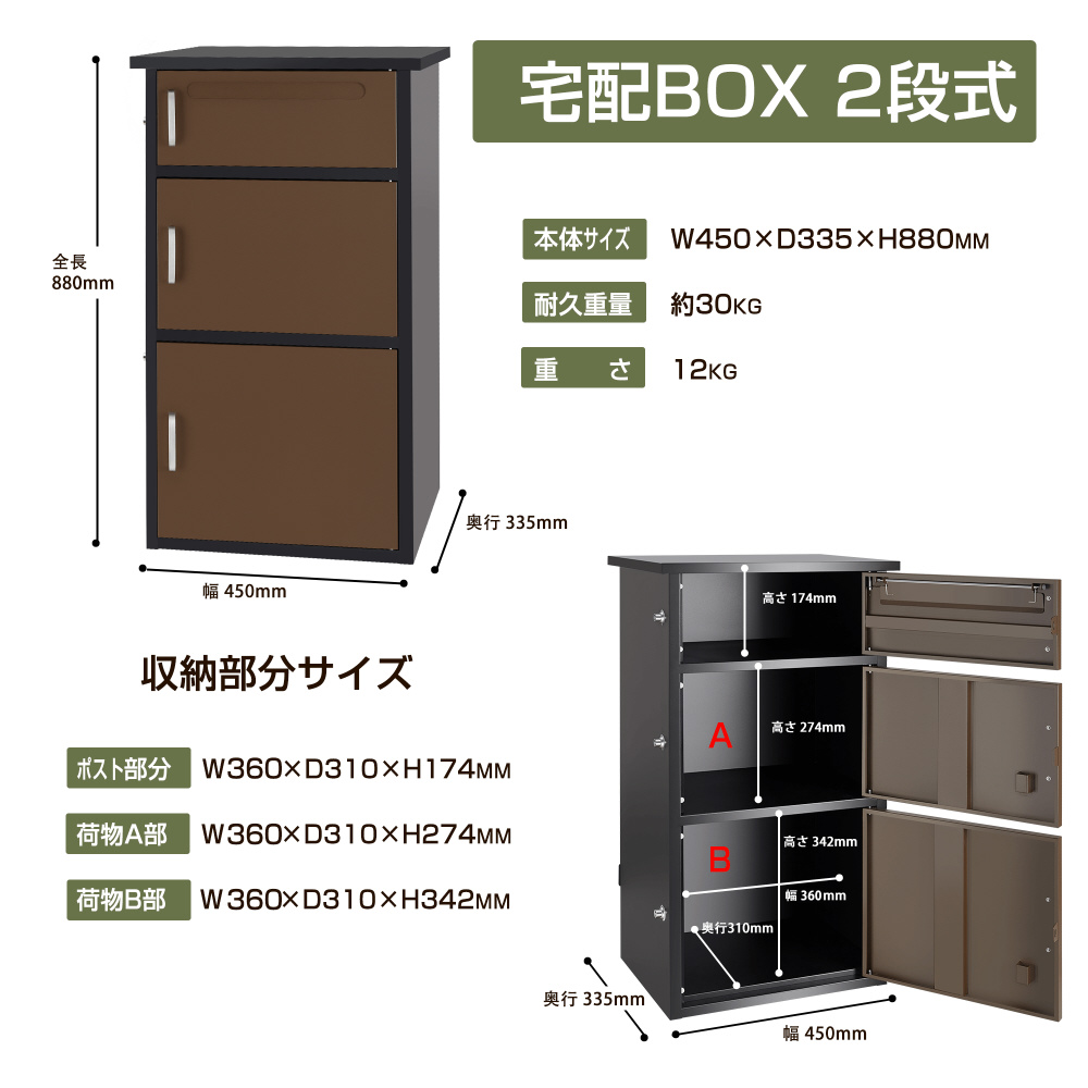 | 仕様1 | 使用環境:−5℃〜40℃ ポスト部分:幅450×奥行335×高さ174mm 荷物部分:幅450×奥行335×高さ274mm 荷物部分:幅450×奥行335×高さ342mm ワイヤーの長さ:2m 耐久重量:約30kg 重さ:12kg |