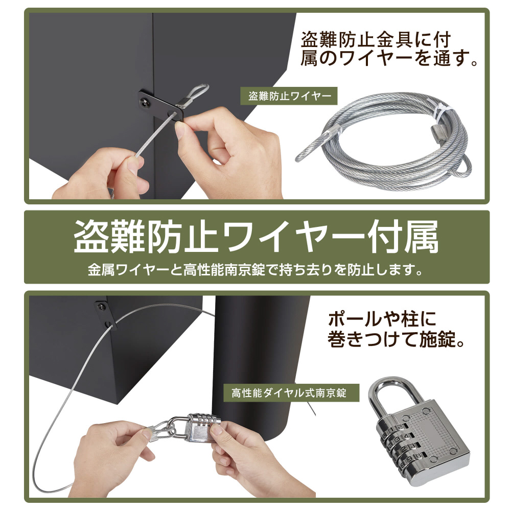 2.本製品はワイヤーが付属しております。取っ手や策などに取り付けて持ち去り防止で不在時も安心です。