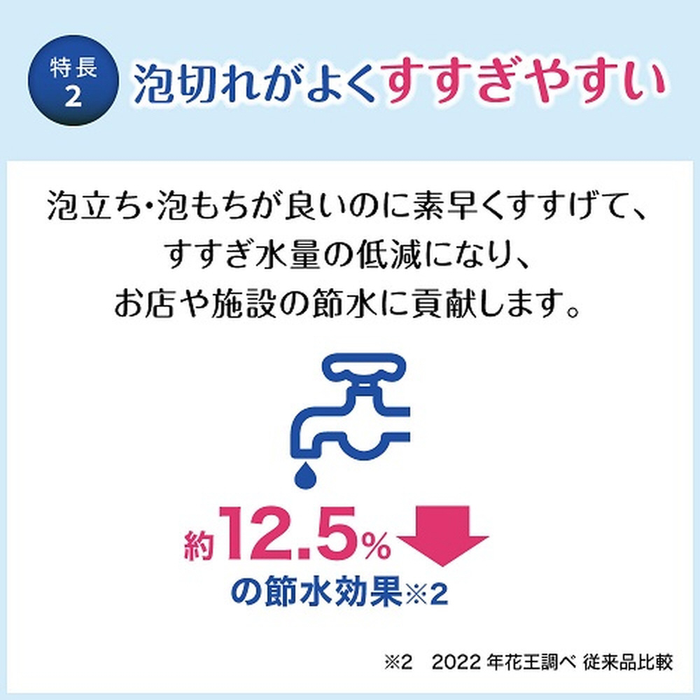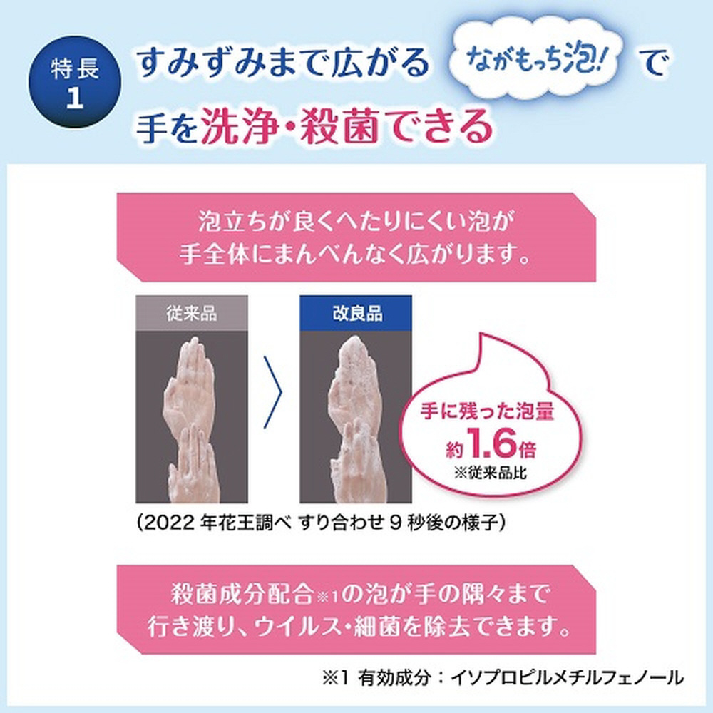 1プッシュでも洗浄中へたりにくい「ながもっち泡」で、手指のすみずみまで洗いやすい泡タイプのハンドソープです。