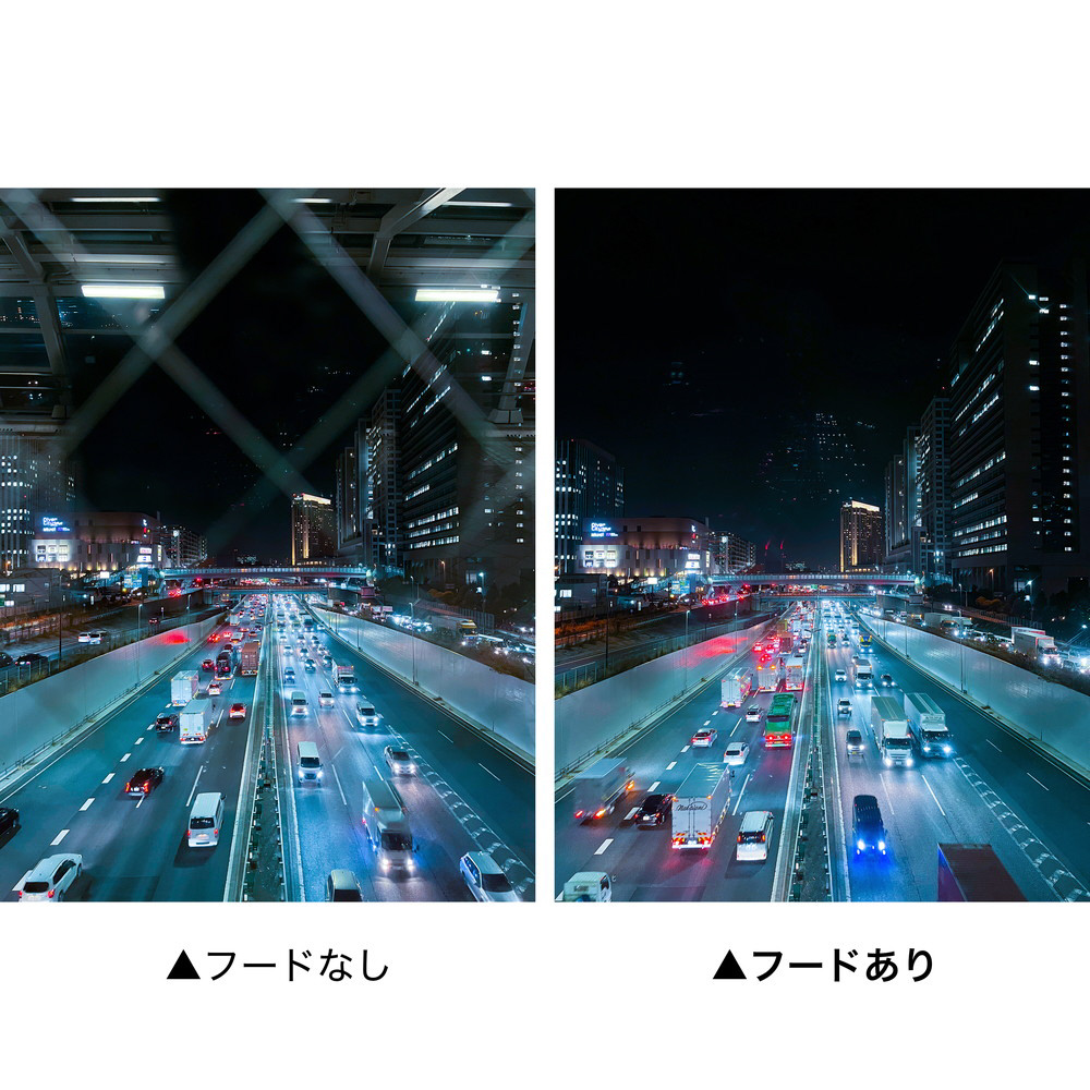 ガラスの反射や映り込みを防ぐレンズフードとセット