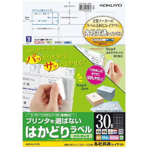 | 商品名 | コクヨ プリンタを選ばないはかどりラベル A4 30面 100枚入り KPCE1301100N |