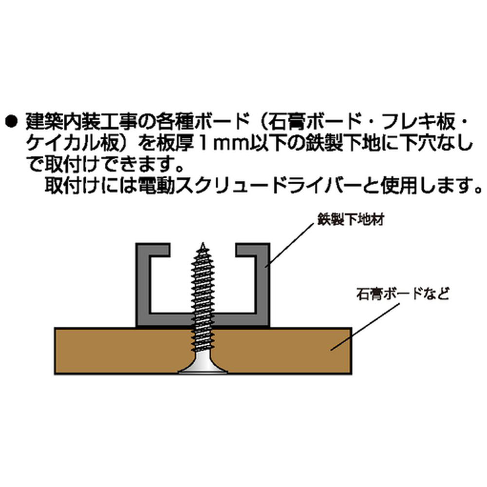 石膏ボード等の内装工事のボードを板厚1mm以下の鋼製下地に下穴なしで取り付けできます。