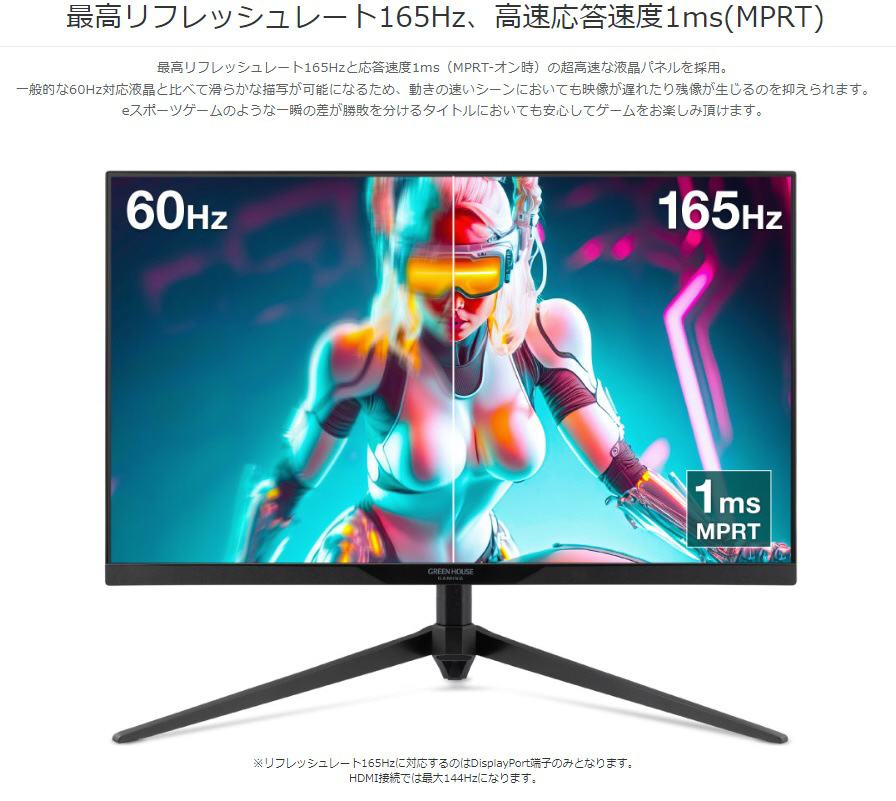 最高リフレッシュレート165Hz、高速応答速度1ms