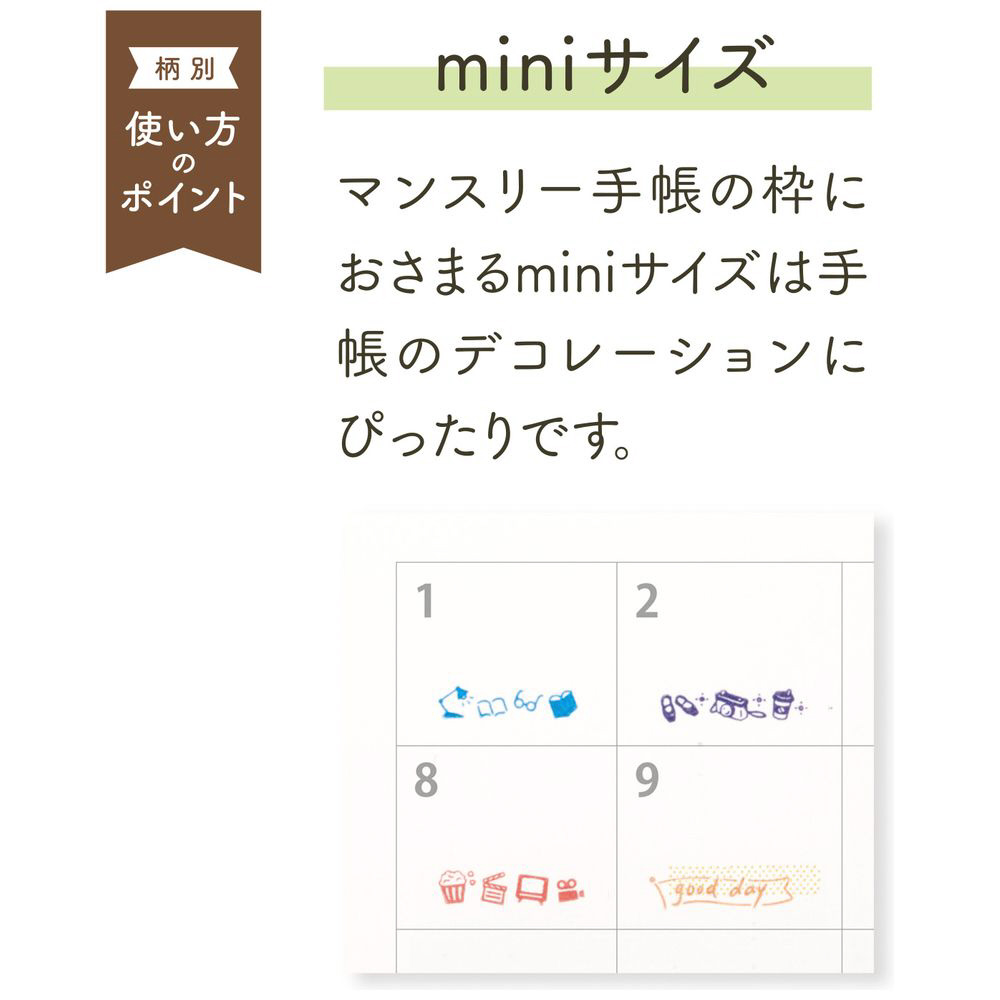 ・マンスリー手帳の枠におさまるminiサイズは手帳のデコレーションにピッタリです。