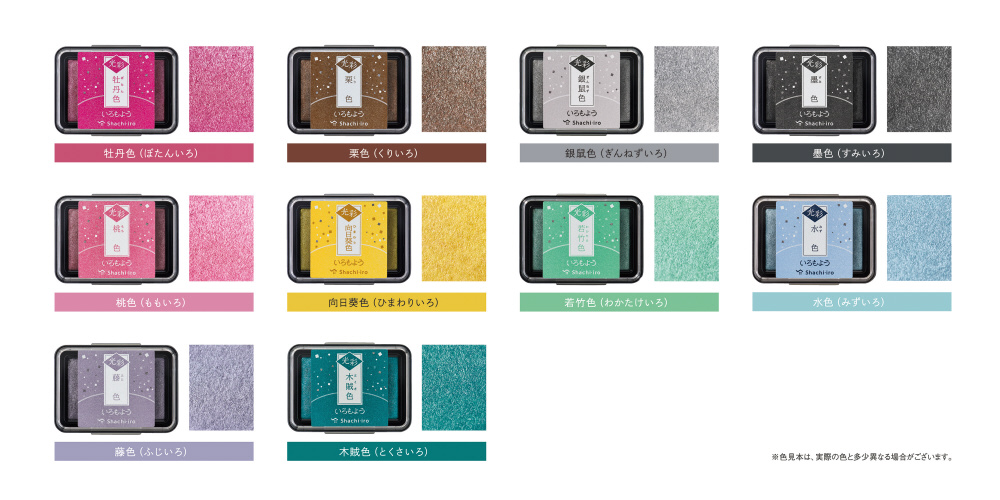 カラーバリエーションは、日本の伝統色から選定された全10色をご用意。細かな柄も、広い面も、思いのままに美しく表現できます。キラめく上品な光沢で、消しゴムはんこやゴム印での作品づくりをランクアップしてくれます。