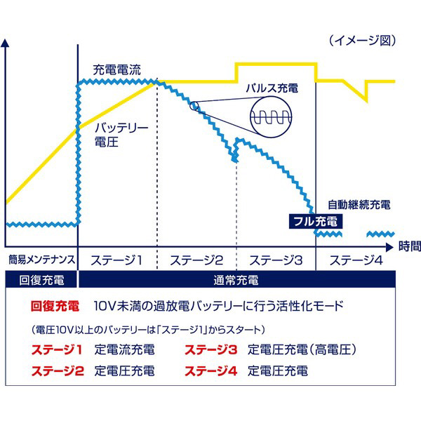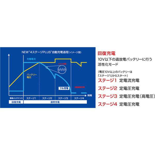 従来の4ステージ充電に「回復充電機能」をPLUS! 過放電バッテリー(10V未満)検出時は、通常充電の前に自動で機能し、低電流でやさしく充電を行い、起電力を10V程度まで回復させます。