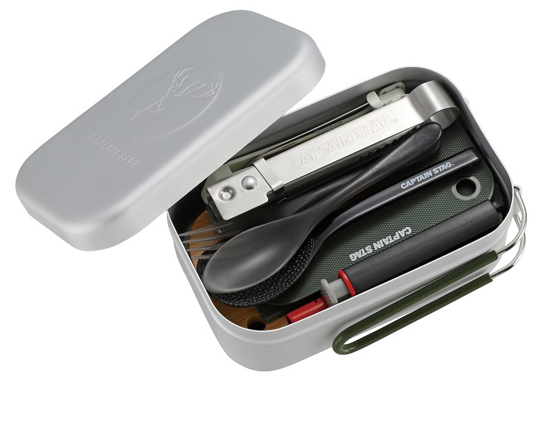 アルミ角型クッカーの中に他の小物と一緒に収納可能。