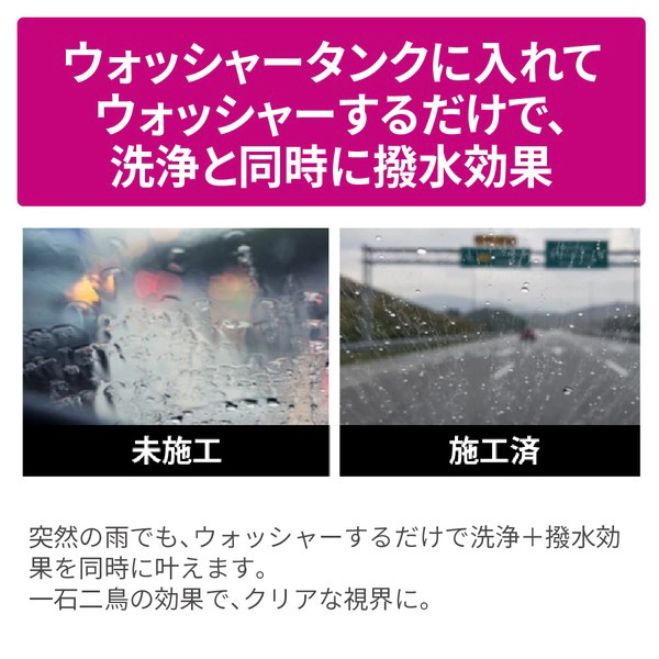 ・ウォッシャータンクに入れてウォッシャーするだけで、洗浄と同時に撥水効果