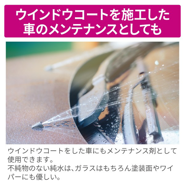 ウインドウコートをした車にもメンテナンス剤として使用できます。不純物のない純水は、ガラスはもちろん塗装面やワイパーにも優しい。