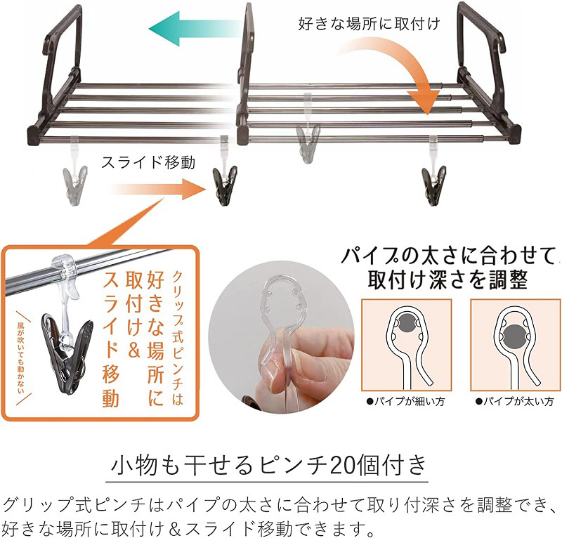 専用取り付けピンチはスライド式なので洗濯物に合わせてピンチを移動できます。