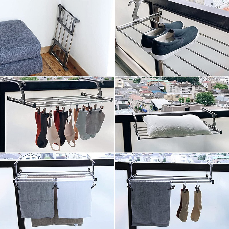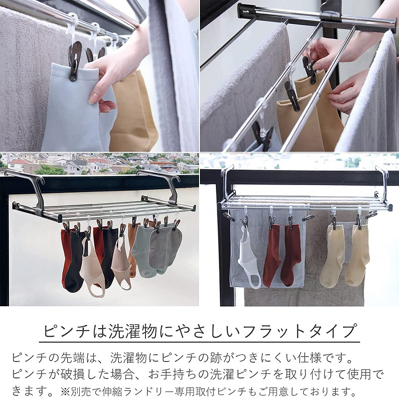 付属ピンチで従来の伸縮ランドリーラックでは干せなかった靴下やマスクなどの小物も干せるようになりました。