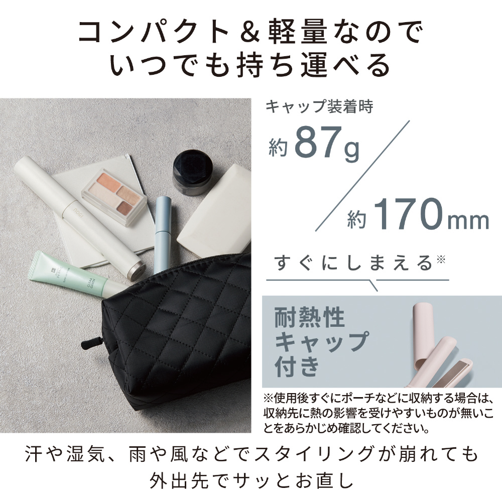 小さめのバッグやポーチなどに入れて、持ち運びできる、長さ約17cm、重さ約87gのコンパクトで軽いヘアアイロンです。(※キャップ装着時)