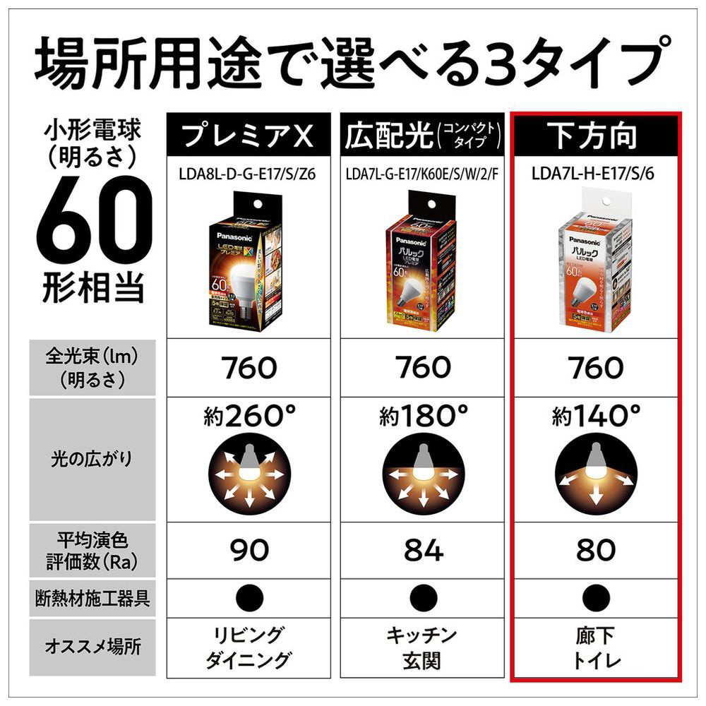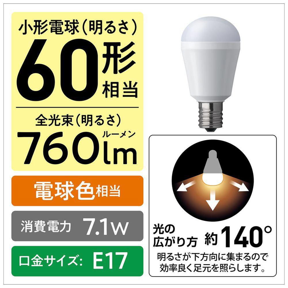 | 商品名 | LED電球 [E17 /一般電球形 /60W相当 /電球色 /1個 /下方向タイプ] LDA7LHE17S6 |