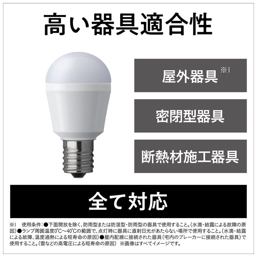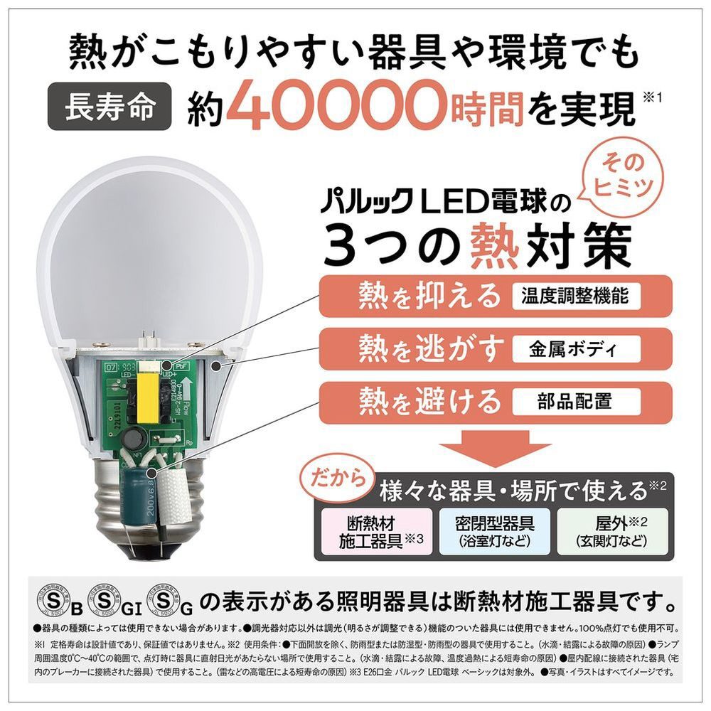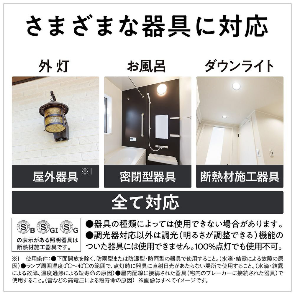 ダウンライトなど天井等に敷き詰められた断熱材を持ち上げるようにして取り付けられた照明器具を「断熱材施工器具」と呼びます。断熱材施工器具でLED電球を使用した場合、断熱材で放熱が妨げられてランプの温度が上昇し、短寿命の原因となることがあります。下方向を照らすタイプは断熱材施工器具に対応。ダウンライトにも安心してご使用いただけます。