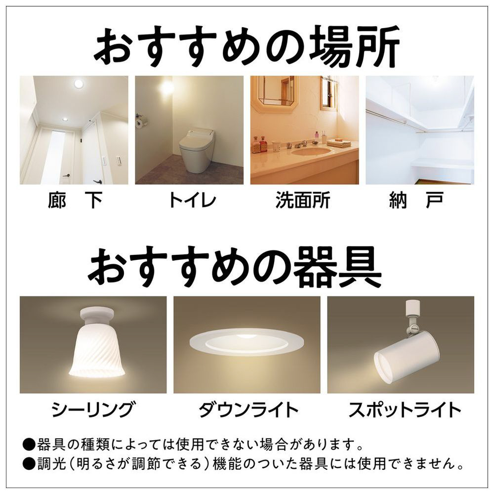 廊下やトイレ、洗面所など、手元や足元の明るさが必要な場所におすすめです。