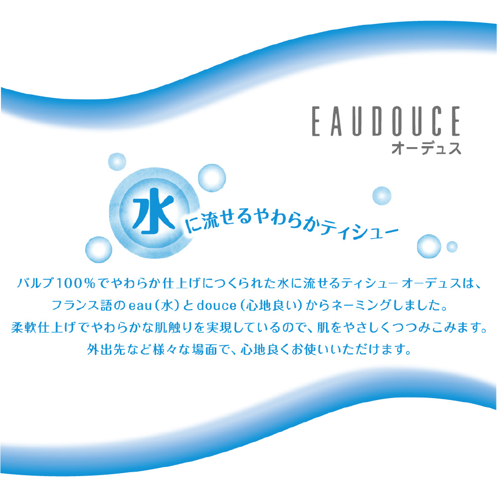 お出かけに便利なポケットタイプ。トイレに流せる水解性のティシュー。パルプ100%。