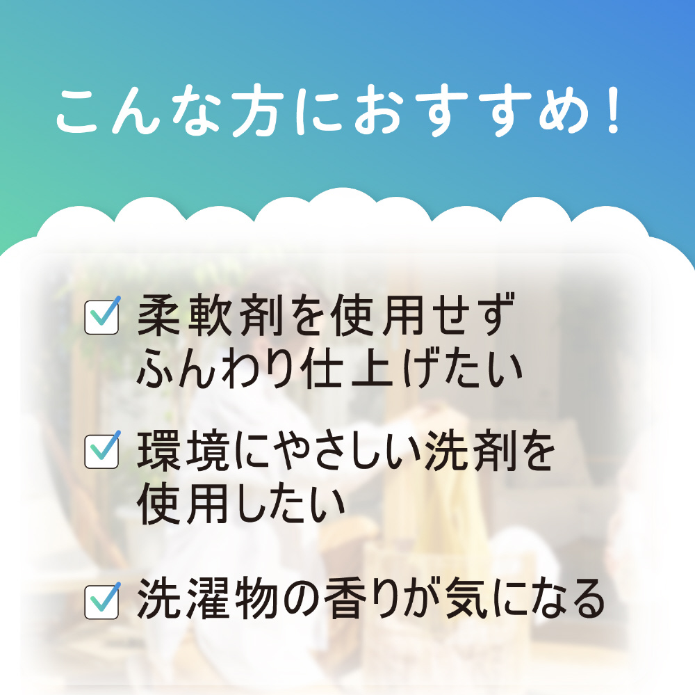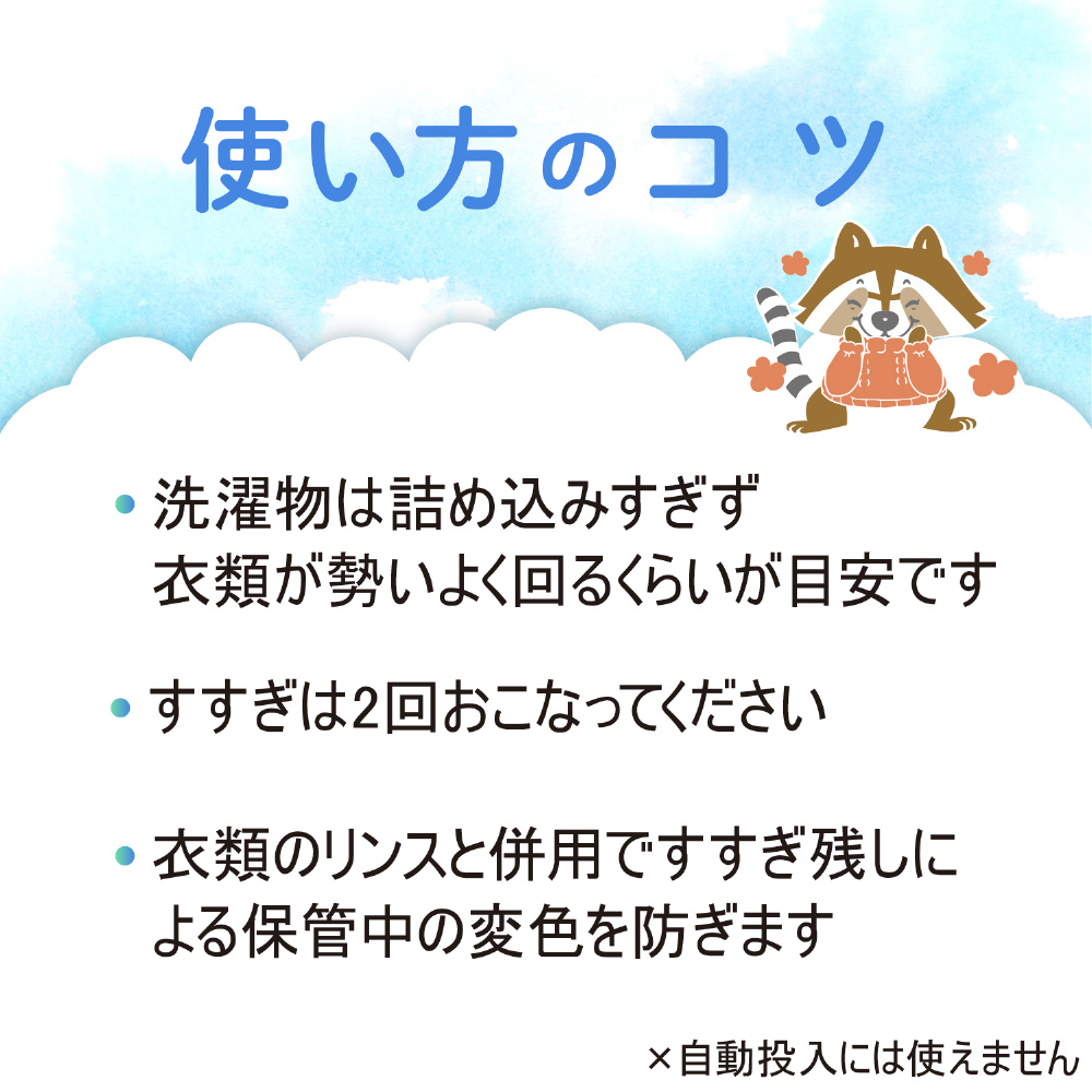 ●アルカリ剤(炭酸塩)無配合のため、絹やウールにもお使いいただけ、ふんわりと洗い上げます。赤ちゃんや肌のデリケートな方への肌着洗いにもお使いいただけます。