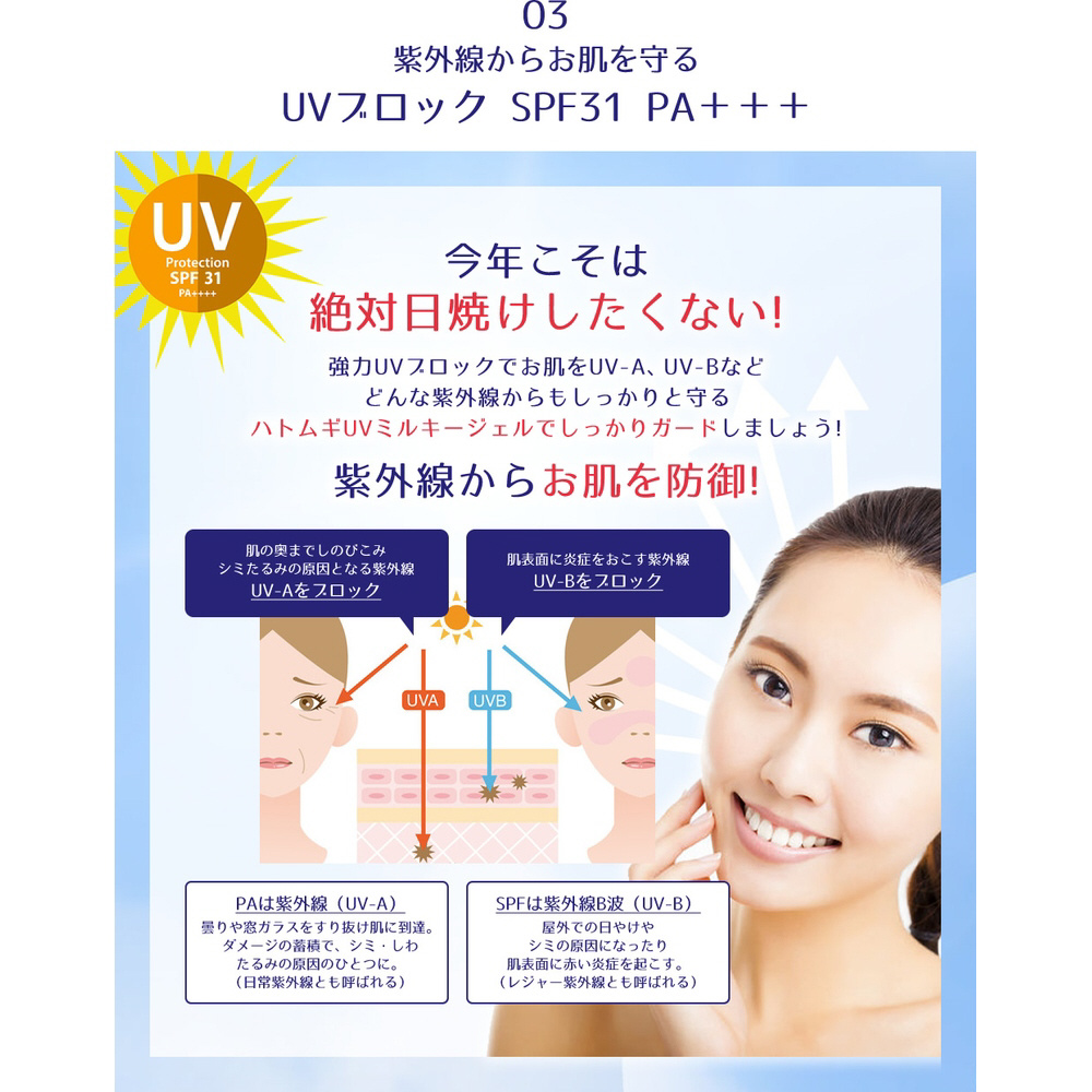 ●保湿成分 ハトムギエキス&ヒアルロン酸配合で、紫外線と乾燥からお肌を守ります。