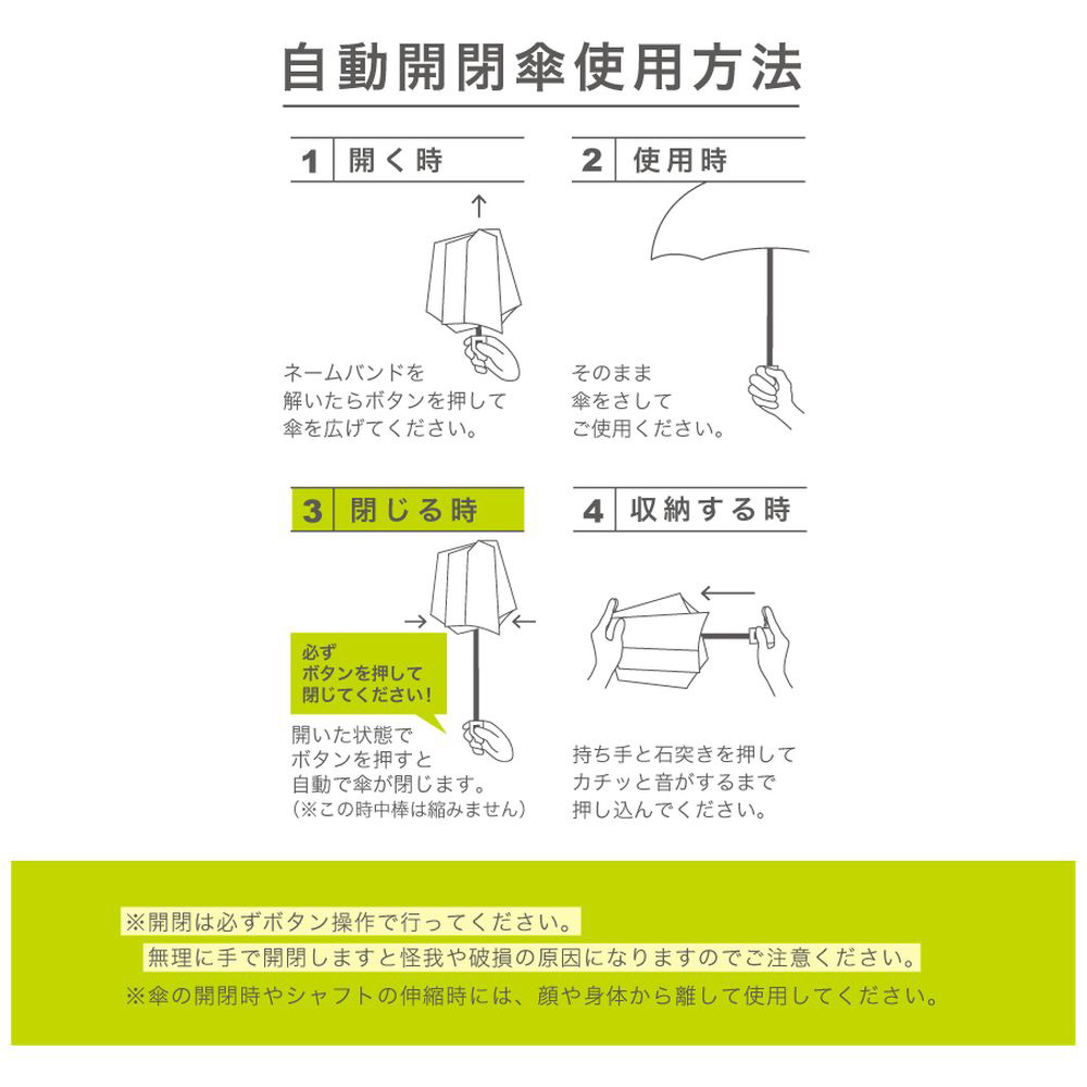 すぐに、楽に、片手で操作したい。そんなシーンや用途に合わせて作られた日傘です。荷物が多いときなどに片手で操作ができて非常に便利です。中棒の収納の途中で手を放しても、中棒が飛び出さず徐々に収納することができる、安全構造を採用した自動開閉式で、ボタンは傘をさしているときに押しまちがいを防ぐカバー付きです。
