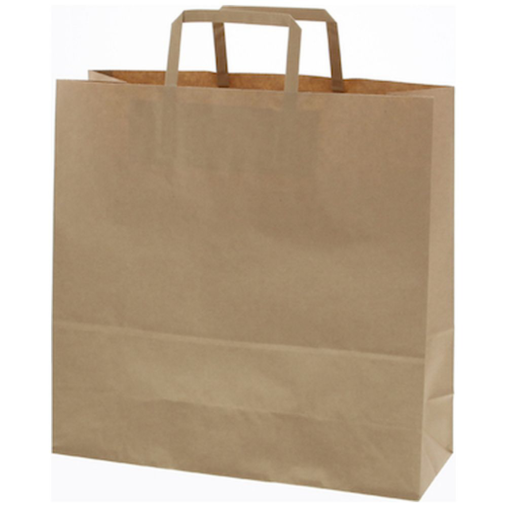 ■もっとも汎用性の高い、プレーンなクラフトの手提げ袋です。未使用時には紐が飛び出ていないため、在庫スペースにやさしい平紐タイプです。