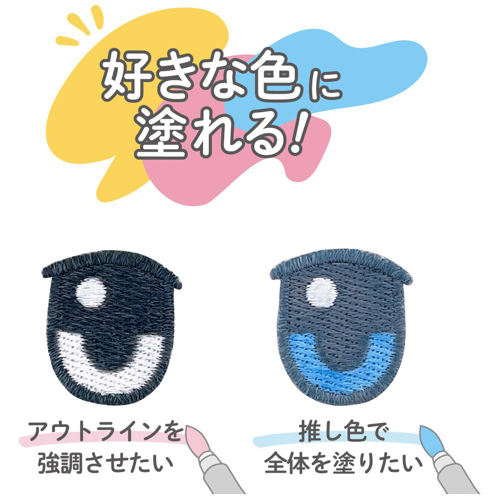 ■清原のフェイスワッペンは、アウトラインがグレーベージュなので、染色ペン・アルコールマーカー(コピックなど)・油性マーカーなどで全体を着色することができ、お好みの”推し”の表情が作れます。