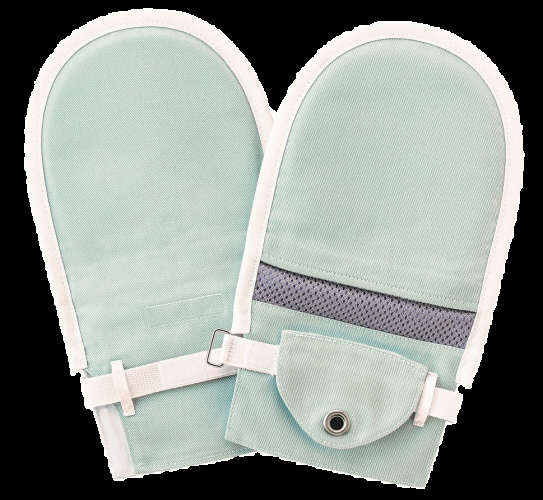 危険な行為やおむついじりに対応する、アイデアホック採用の介護用手袋です。