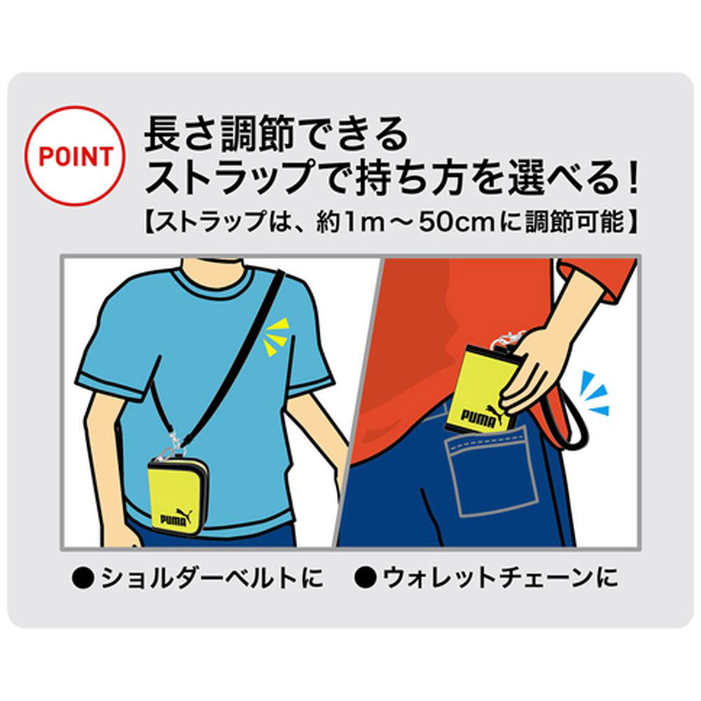 小銭入れが大きく開くことで使いやすく、長さを調整できるストラップ付で持ち方が選べます。