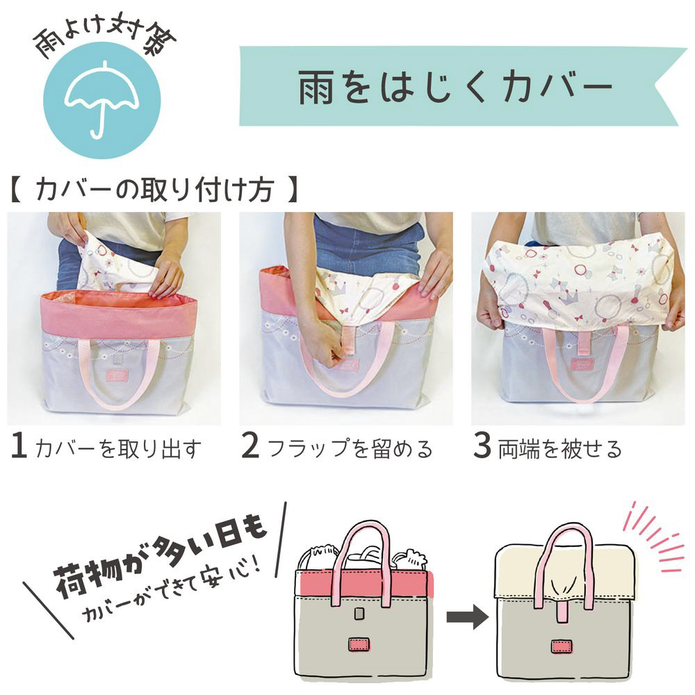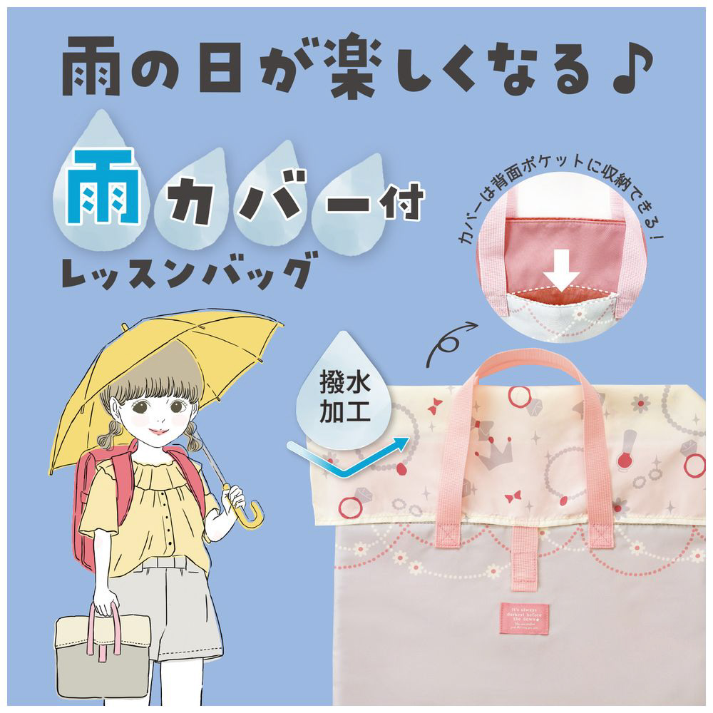 この「レッスンバッグ」は、撥水加工を施した生地を使用し、更にサッと取り出せるカバーが付いているので、急な雨でも安心。